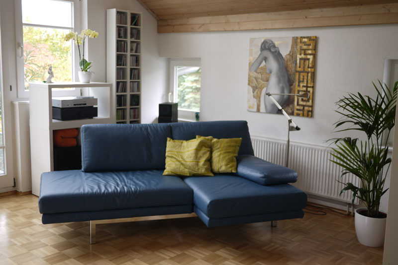 Im Wohnzimmer sieht unser schönes blaues Sofa besonders gut aus.
